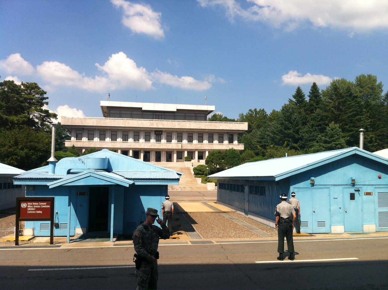 Veröffentlicht am Dienstag, 7. August 2012 14:15 von ThomasJoint Security Area | Panmunjom Vorne Südkorea, hinten Nordkorea. Die Grenze „halbiert“ die Baracken und ist sichtbar an der unterschiedlichen Bodenfärbung dazwischen. Wer findet den nordkoreanischen Späher?